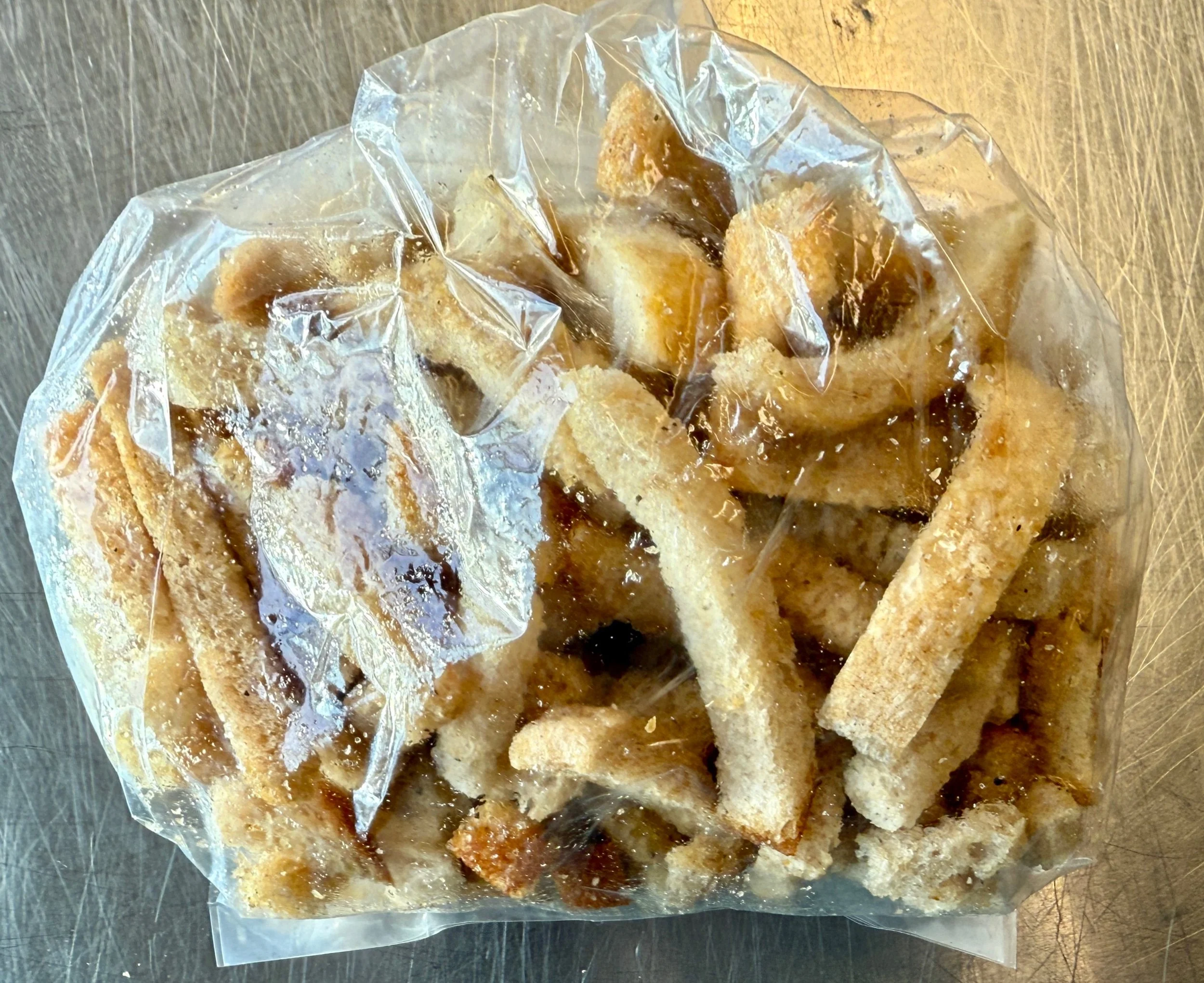 A mix of white and wheat sourdough cut into smaller pieces, tossed with olive oil, rosemary, black pepper and salt and toasted. Perfect for stuffing or lightly warm them in the oven and use as croutons on a salad.